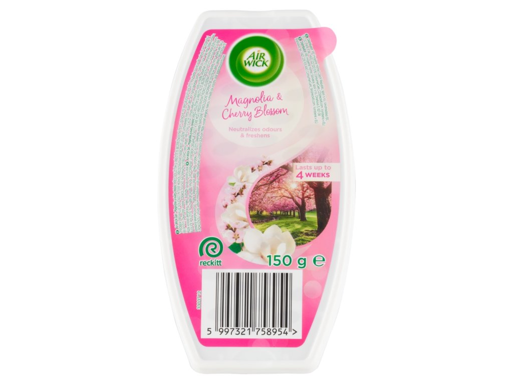 Gel Air Wick Magnolia in češnjev cvet. S sprednje strani izdelka v celoti ali delno odstranite folijo, da zagotovite postopno sproščanje dišave.