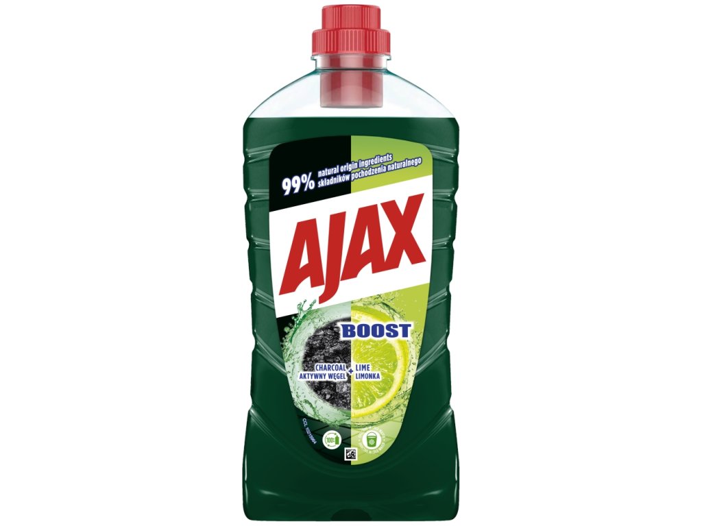 AJAX univerzalno čistilo Boost Charcoal+Lime 1 l, čistilo za tla, nežno do občutljivih površin (keramika, marmor). Svež vonj čistoče po limeti tudi naslednji dan! Ajax s svojo edinstveno svežino, ki se aktivira z zrakom, neprekinjeno sprošča svoj svež vonj več kot 24 ur. Nova biorazgradljiva formula.
