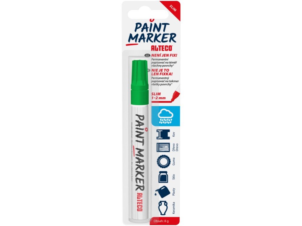 Vodoodporen in hitrosušeč marker na oljni osnovi, zasnovan za zanesljivo označevanje širokega nabora materialov. Primeren za notranjo in zunanjo uporabo, je odporen na vodo, odrgnine in zagotavlja dolgotrajne rezultate. Barvo lahko odstranite z acetonom. UPORABA Idealen za gospodinjstva, obrtnike in industrijsko uporabo: Gospodinjstvo: označevanje plastičnih in steklenih steklenic, etiket za police, CD-jev, DVD-jev, paketov, pnevmatik, poštnih nabiralnikov, cvetličnih lončkov in posod Obrt: povezovalni in električni material, steklo, ogledala, plastični, leseni in kovinski deli, omare, stikala, razdelilne omarice, odklopniki Industrija: metalurški materiali, motorji, kovinski in plastični rezervoarji, transportna embalaža, gradbeni materiali, električne inštalacije, uplinjanje, označevanje za inšpekcijske preglede Ni primeren za mehčani PVC in za označevanje materialov, namenjenih stiku z živili. LASTNOSTI · Zelena barva · Vodoodporen in odporen proti odrgninam · Primeren za širok spekter materialov · Primeren za notranjo in zunanjo uporabo · Hitro sušeč · Dolgotrajni napisi · Odstranljiv z acetonom · Enostaven nanos zahvaljujoč visokokakovostni konici UPORABA Pred uporabo tesno zaprite pokrovček in dobro pretresite, dokler se kovinska kroglica v notranjosti ne začne gladko premikati. Konico večkrat pritisnite ob mehko blazinico, da vpije barvo. Po uporabi tesno zaprite, da preprečite izsušitev.