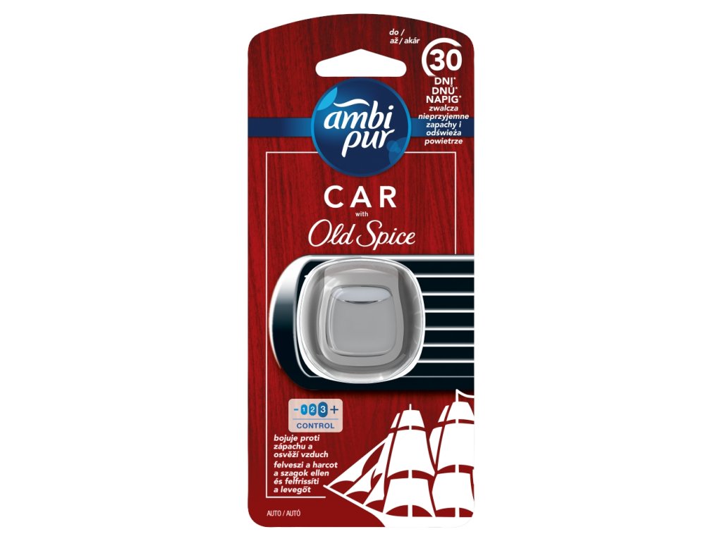 Osvežilec zraka za avto Ambi Pur Old Spice z edinstveno tehnologijo OdourClear neprekinjeno odpravlja neprijetne vonjave v avtomobilu, kot so vonjave hrane, hišnih ljubljenčkov, dima ali smeti, in pušča zrak prijetno svež. Vonj je navdihnjen s svežino citrusov in mete. Intenzivnost vonja lahko celo prilagodite s kolescem ob strani. Osvežilec zraka je enostaven za uporabo, deluje brez baterij ali elektrike in zdrži do 30 dni. Osvežilec zraka za avto Ambi Pur se preprosto pritrdi na klimatsko napravo vozila in se zaradi diskretne in elegantne oblike popolnoma zlije z notranjostjo avtomobila.