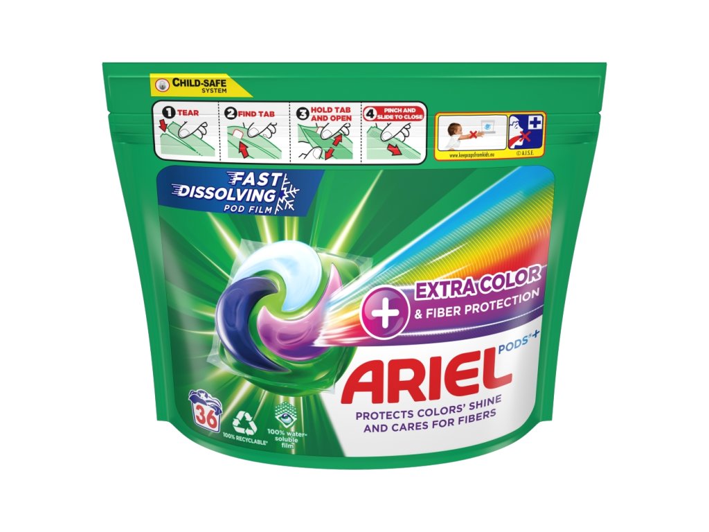 Arielova inovativna embalaža v obliki kapsul se v stiku z vodo popolnoma raztopi in sprosti aktivne sestavine, ki se spopadajo z različnimi madeži – to je Arielov najboljši tekoči detergent s pravim odmerkom. Za dodaten odmerek svežega vonja in mehkobe uporabljajte z mehčalcem za perilo Lenor in dišečimi kroglicami Unstoppables.