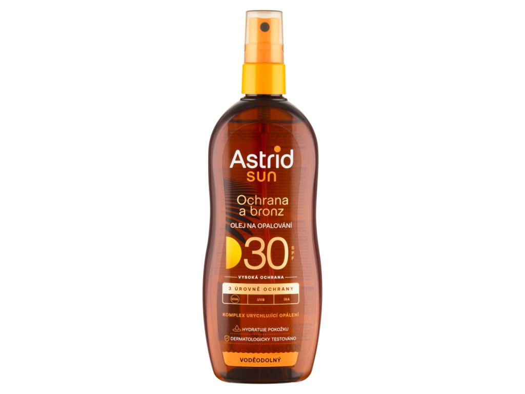 ASTRID SUN olje za sončenje v spreju OF 30 z inovativno tehnologijo zaščite pred soncem ( UVA/UVB/IR *) zagotavlja koži širokospektralno fotostabilno zaščito pred škodljivimi učinki UV in infrardečega sevanja .