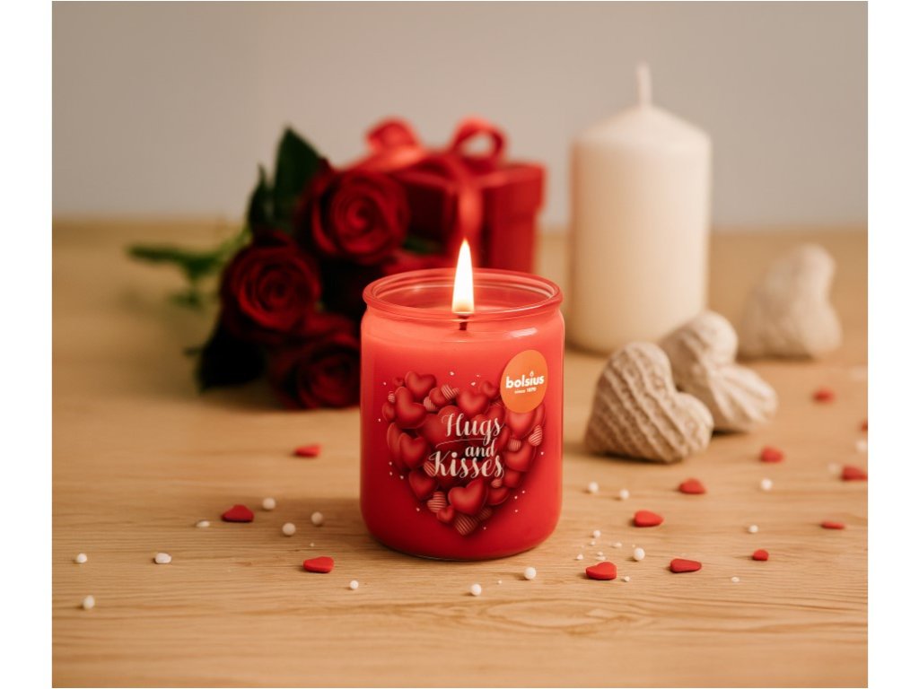 Bolsius steklena rdeča srčka z napisom, mango, dišeča sveča 68x80mm