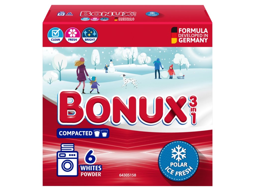 Bonux White Polar Ice Fresh 3v1 Z edinstvenim svežim vonjem je namenjen za belo perilo. Dobili boste dobro pralno moč in svež vonj, ki bi ga pričakovali le od najboljših in najdražjih detergentov. Vsebuje aktivne delce za popolno pranje in komponento, ki preprečuje nalaganje vodnega kamna, perete lahko pri temperaturah od 30 °C. Ne uporabljajte na volni. Na belem perilu preprečuje nalaganje vodnega kamna do 14 dni svežine, učinkovito pranje, dišeče in čisto perilo.