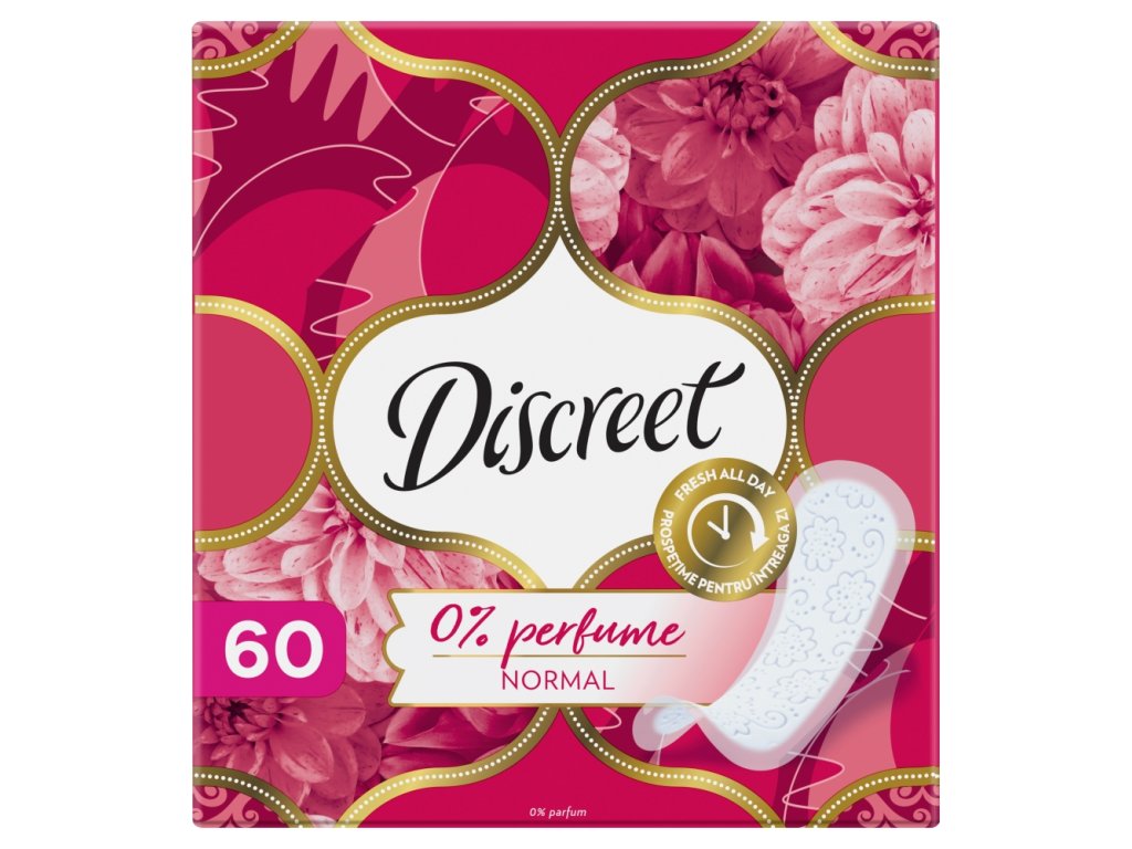 Ostanite sveži in lepi z neparfumiranimi intimnimi vložki Discreet Normal, ne glede na vaš stil! Ti vložki omogočajo koži na intimnih predelih, da naravno diha, in zagotavljajo do 12 ur svežine in udobja. So tako tanki in prožni, da jih sploh ne boste čutili. Prilagajajo se vsakemu vašemu gibu.