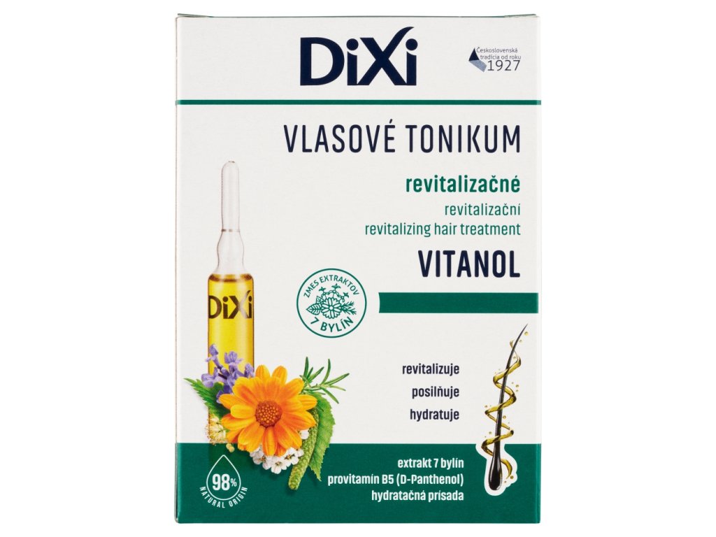 Dixi Vitanol revitalizirajoči tonik za lase za rast las preprečuje izpadanje las in spodbuja njihovo rast. Zahvaljujoč naravnim izvlečkom in vitaminom bodo vaši lasje zasijali od lepote in vitalnosti. Aktivne sestavine, kot so izvlečki breze, koprive, lipe, rmana, ognjiča, rožmarina in sivke, provitamin B5 (pantenol), vitamin F in vlažilna sestavina, zagotavljajo celovito nego in prehrano las in lasišča.