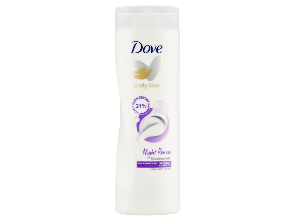 Dove Body Losjon 400 ml Night Renew je nočni losjon za telo, zasnovan za regeneracijo kože med spanjem. Vsebuje edinstven 21-odstotni kompleks Skin Renew z niacinamidom, ki pospeši regeneracijo kožnih celic v samo treh nočeh.