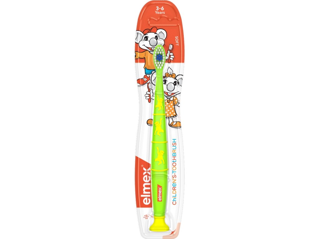 Dvakrat na dan nanesite količino otroške zobne paste v velikosti graha na otrokovo zobno ščetko. Rumeni del ščetin služi kot pomoč pri pravilnem odmerjanju zobne paste.