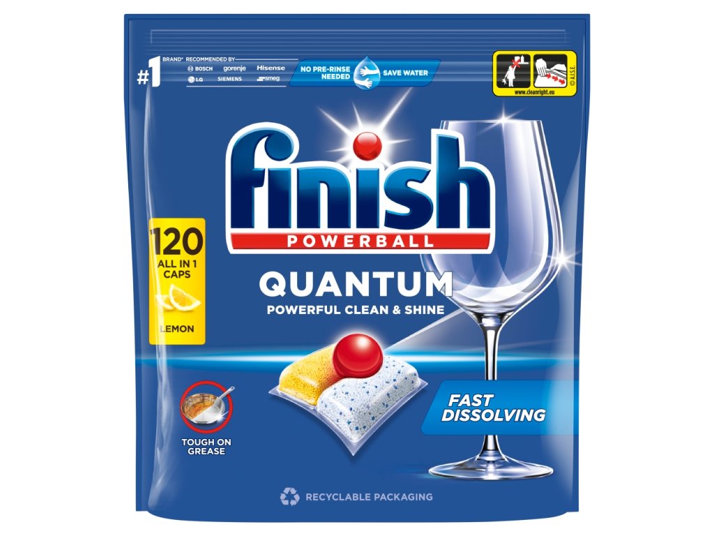 Finish Quantum se spopade z vsem, kar mu pride na pot. Njegova močna formula s PowerBallom zagotavlja najboljšo čistočo in sijaj vaše posode, hkrati pa pomaga zaščititi pred nabiranjem vodnega kamna v pomivalnem stroju.