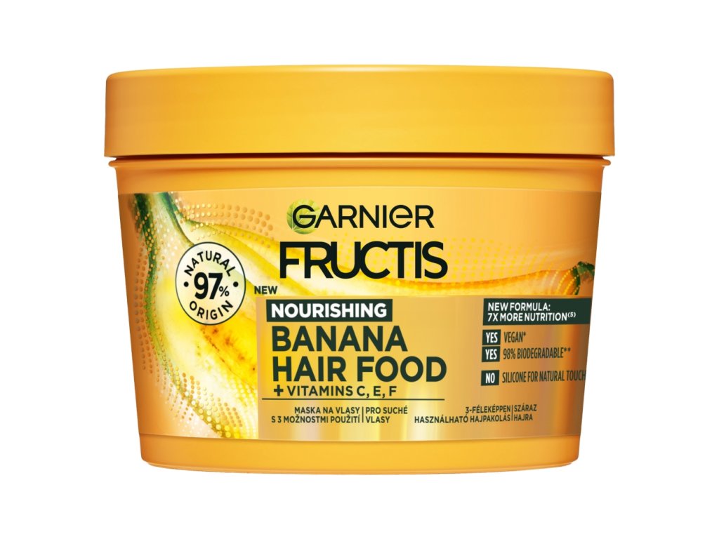 Konec poškodovanim in suhim lasem enkrat za vselej z Garnier Fructis Banana Hair Food. Maska za lase Garnier Hair Food z dodatkom banan in rastlinskih olj učinkovito in nežno neguje vaše suhe lase ter jim vrača prvotno vitalnost . Garnier Fructis Banana vsebuje 98 % naravnih sestavin in je Popolnoma brez parabenov, silikonov in umetnih barvil. Z masko Hair Food boste izkusili moč banan na svojih laseh in jim povrnili izgubljeno mehkobo in gladkost .