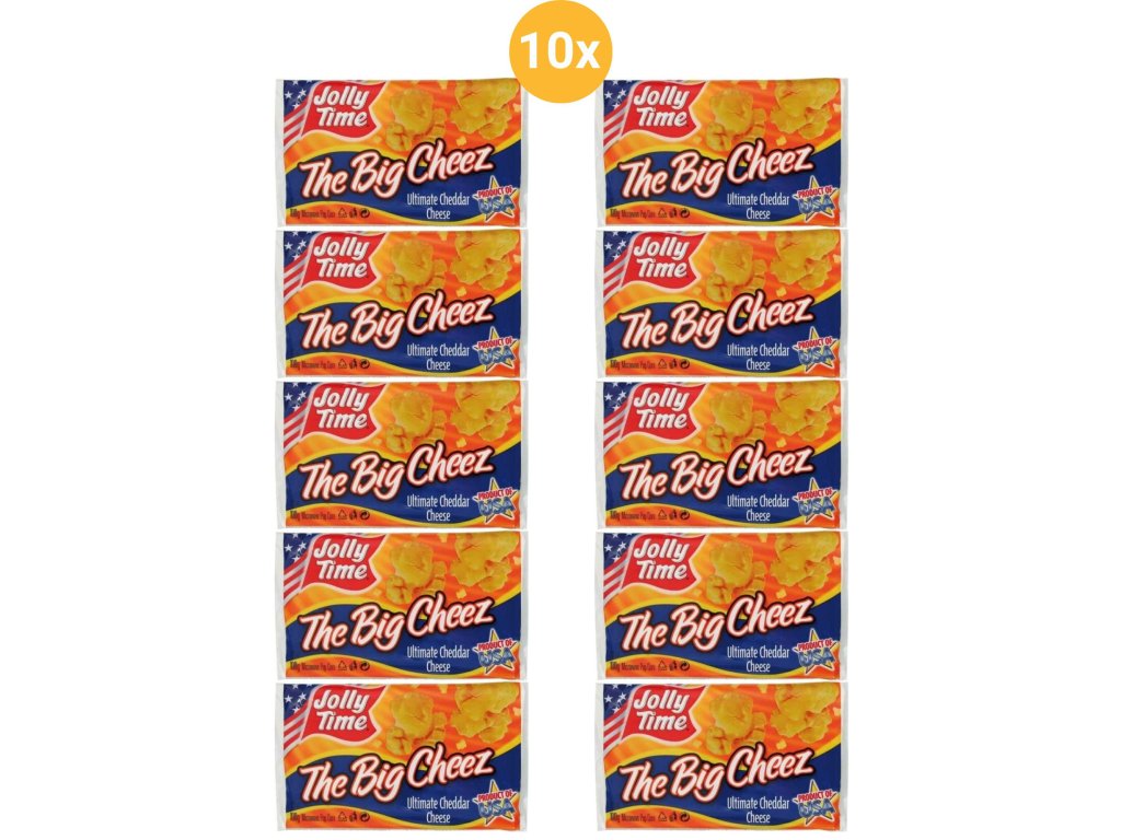 Jolly Time The Big Cheez mikrovalovne kokice z močnim okusom sira so odlična izbira za hiter slan prigrizek ali filmski večer. Vrečko preprosto postavite v mikrovalovno pečico in v nekaj minutah boste uživali v sveže pripravljenih kokicah z intenzivnim okusom cheddarja.