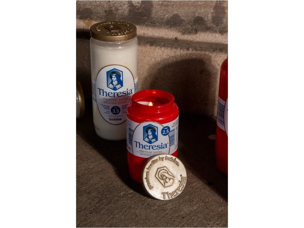Kompozitna sveča Theresia v rdeči barvi, idealna za okrasitev groba. Gori do 2,5 dni.