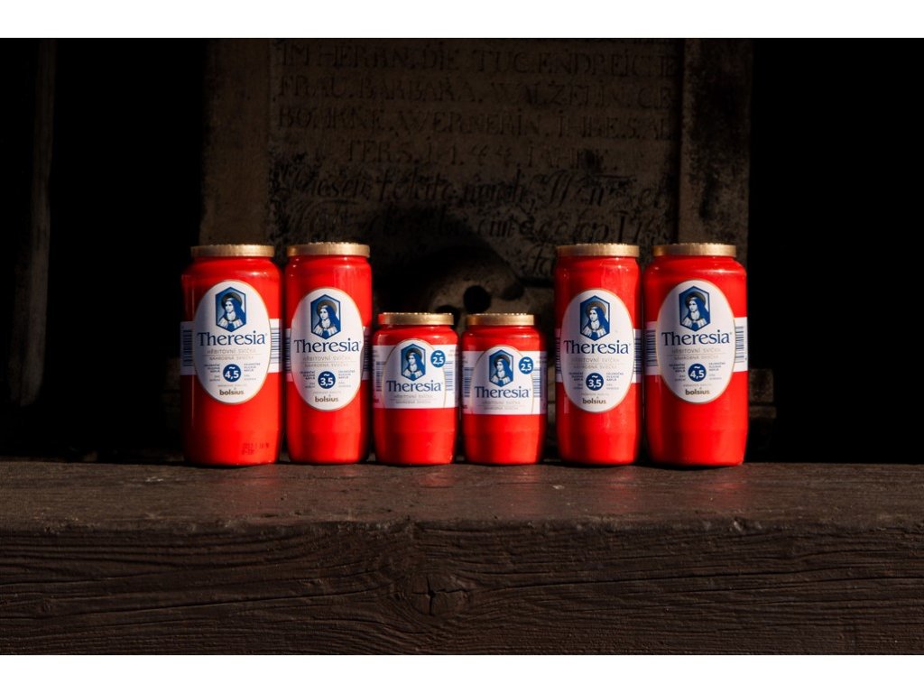 Kompozitna sveča Theresia v rdeči barvi, gori do 4,5 dni.