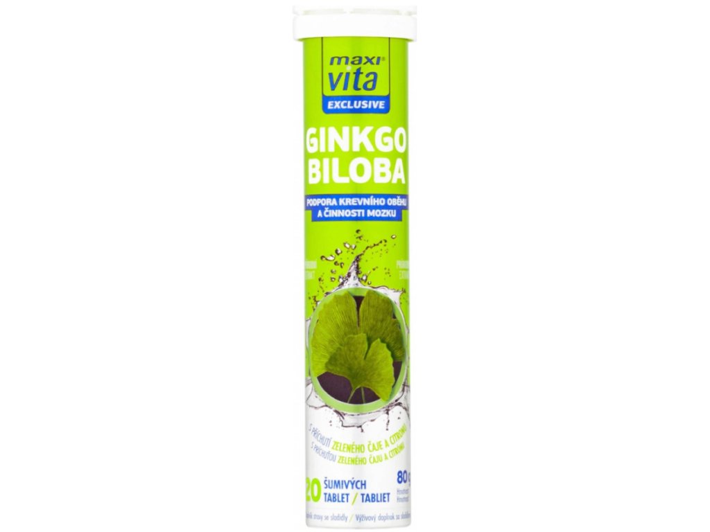 Maxi Vita Exclusive Ginkgo biloba podpira dobro počutje in duševno svežino. Pozitivno vpliva na krvni obtok. Šumeče tablete imajo okus limone in zelenega čaja.