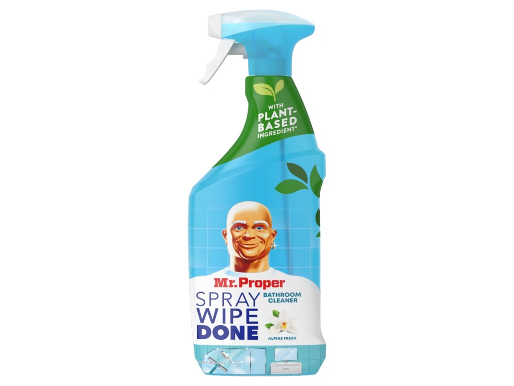 Kopalniški sprej Mr. Proper odstrani madeže vode in milo z vseh kopalniških površin – brez drgnjenja ali puščanja lis.