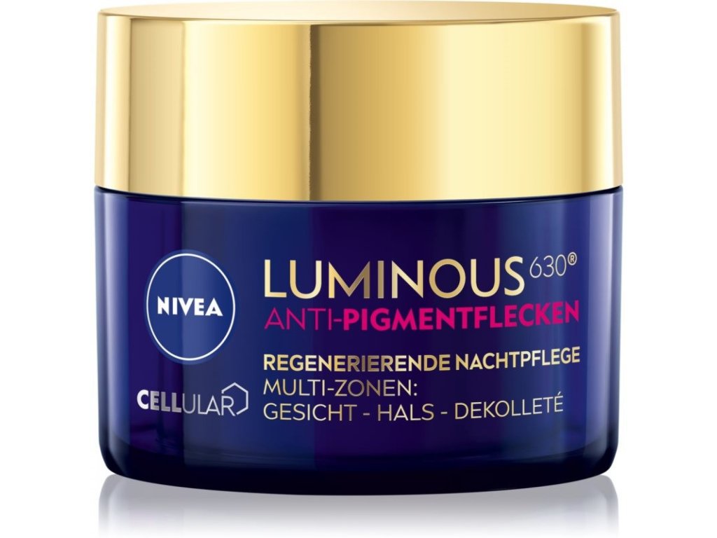 Nočna krema Cellular Luminous630 vsebuje aktivno sestavino Luminous630, ki med drugim podpira obnovo kožnih celic. Hkrati zmanjšuje pigmentne madeže in preprečuje njihov ponovni pojav. Hialuronska kislina pa zapolni gube in aktivira kožne celice. Privoščite svoji koži oddih: NIVEA Cellular Luminous630 nočna krema.