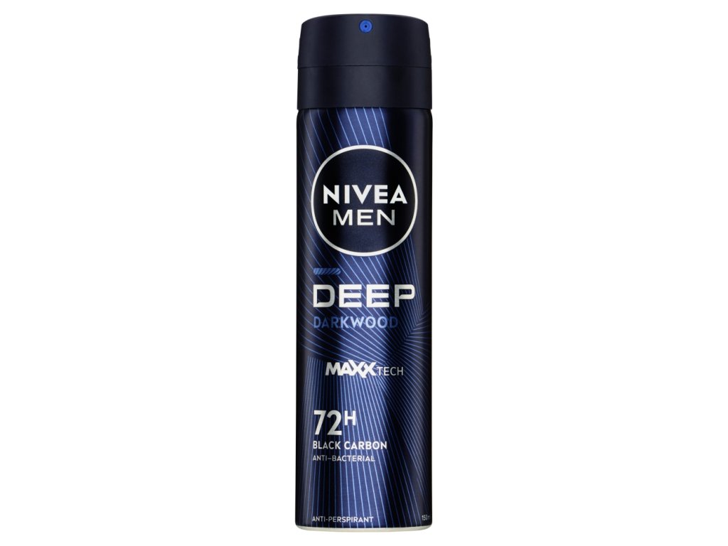 Pozabite na prekomerno potenje in doživite osvežitev, ki prodre globoko v čute. Posebna formula s črnim ogljem aktivno uničuje bakterije in učinkovito ščiti pred potenjem 48 ur . Privlačna dišava z globokim prizvokom temnega lesa bo pustila vtis, ki ne bo zbledel - NIVEA antiperspirant v spreju za moške DEEP.