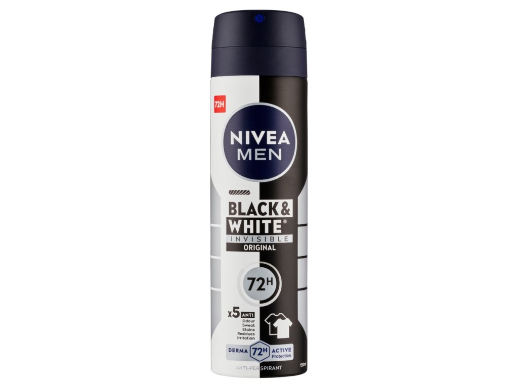 Odkrijte resnično učinkovit antiperspirant s poživljajočim moškim vonjem, ki ščiti pred potenjem in neprijetnim vonjem, hkrati pa ščiti vaša oblačila. Laboratoriji NIVEA so prvi razvili formulo antiperspiranta z edinstveno patentirano tehnologijo, ki preprečuje bele madeže na črnih oblačilih in pomaga preprečevati rumene madeže , ki se sčasoma lahko pojavijo na belih oblačilih. Spoznajte vodilnega svetovnega proizvajalca deodorantov, ki ne puščajo madežev na oblačilih - NIVEA MEN Invisible for Black & White antiperspirant v spreju za moške.