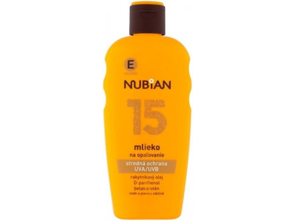 - Nubian Sun Lotion SPF 15 z oljem rakitovca, D-pantenolom, betakarotenom. Kombinacija UVA/UVB filtrov - ščiti kožo pred sončno svetlobo olje rakitovca - učinkovit antioksidant z visoko vsebnostjo naravnega betakarotena vitamin E - antioksidant, zaščita celic in regeneracija kože D-panthenol - hrana za kožo in pomirjanje fito kompleks - kompleks rastlinskih izvlečkov z učinkom proti draženju Losjon se enostavno nanaša in ne pušča mastnega občutka na koži. Uporaba: za zaščito celotnega telesa olje enakomerno nanesite v količini 6 čajnih žličk na suho kožo 15 minut pred sončenjem. Izogibajte se predelu okoli oči. Nanos manjše količine zmanjša raven zaščite. Nanos redno ponavljajte čez dan, zlasti po potenju, kopanju ali sušenju z brisačo. Izogibajte se prekomerni sončni svetlobi v opoldanskih urah in se zaščitite z oblačili, pokrivali in sončnimi očali. Dojenčkov in majhnih otrok ne izpostavljajte neposredni sončni svetlobi. Prekomerno izpostavljanje soncu je resna nevarnost za zdravje. Krema za sončenje lahko pusti kontaktne madeže na tkaninah in drugih materialih.
