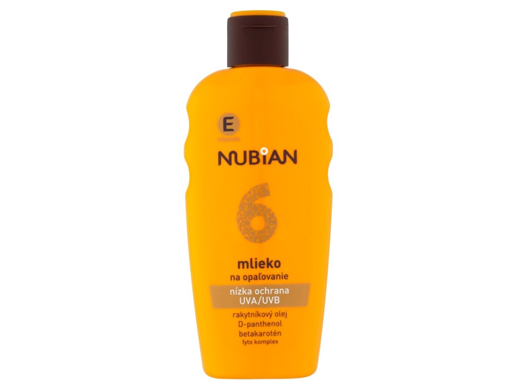- Nubian Sun Lotion SPF 6 z oljem rakitovca, D-pantenolom, betakarotenom. Kombinacija UVA/UVB filtrov - ščiti kožo pred sončno svetlobo olje rakitovca - učinkovit antioksidant z visoko vsebnostjo naravnega betakarotena vitamin E - antioksidant, zaščita celic in regeneracija kože D-panthenol - hrana za kožo in pomirjanje fito kompleks - kompleks rastlinskih izvlečkov z učinkom proti draženju Losjon se enostavno nanaša in ne pušča mastnega občutka na koži. Uporaba: za zaščito celotnega telesa olje enakomerno nanesite v količini 6 čajnih žličk na suho kožo 15 minut pred sončenjem. Izogibajte se predelu okoli oči. Nanos manjše količine zmanjša raven zaščite. Nanos redno ponavljajte čez dan, zlasti po potenju, kopanju ali sušenju z brisačo. Izogibajte se prekomerni sončni svetlobi v opoldanskih urah in se zaščitite z oblačili, pokrivali in sončnimi očali. Dojenčkov in majhnih otrok ne izpostavljajte neposredni sončni svetlobi. Prekomerno izpostavljanje soncu je resna nevarnost za zdravje. Krema za sončenje lahko pusti kontaktne madeže na tkaninah in drugih materialih.