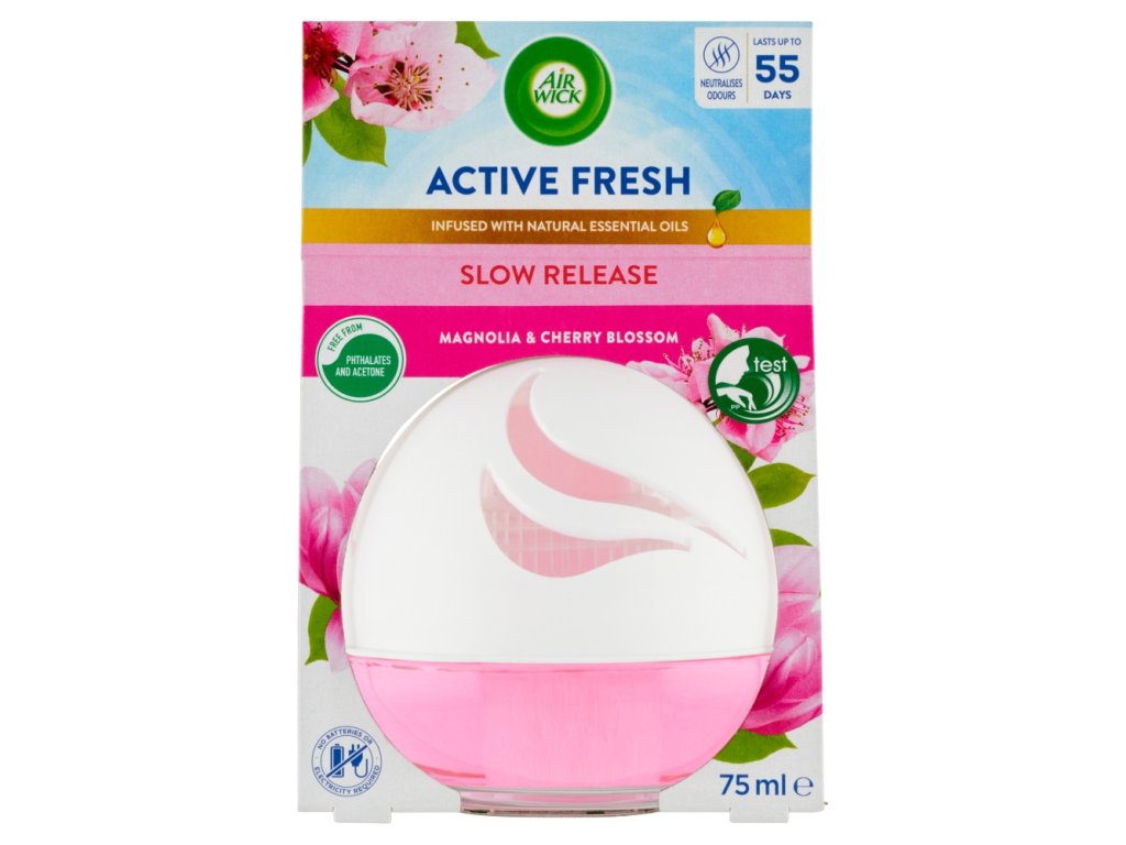 Air Wick Active Fresh je eleganten osvežilec zraka, ki bo prijetno odišavil vaš dom. Uporablja poseben stenj, ki sprošča in širi vonj, na voljo je v dekorativni steklenički s pokrovčkom. Ne potrebujete baterij ali elektrike. Dišavo lahko postavite v kopalnico, stranišče ali spalnico. Uživajte v domu, polnem svežega vonja magnolije z notami češnjevih cvetov, do 55 dni. UPORABA: Navodila za uporabo: 1. Odstranite zunanji pokrovček z izdelka. 2. Odvijte pokrovček s steklenega dela izdelka in ga postavite na stran. 3. Previdno zaprite zunanji pokrovček. Uporabljajte samo po navodilih. HRANITE V ZGORNJEM POLOŽAJU. NE DOTIKAJTE SE STENJA. Razlitje izdelka lahko poškoduje površino, zato jo takoj obrišite. Uporabljajte samo v dobro prezračevanih prostorih. Izdelek ni namenjen negi otrok in se ne sme uporabljati v otroških sobah. NE UPORABLJAJTE KOT DIŠAVA. Zaščitite pred sončno svetlobo. V motornih vozilih in v bližini peči in kaminov se lahko pojavijo ekstremne temperature. Namerna zloraba z namernim koncentriranjem in vdihavanjem vsebine je lahko škodljiva ali smrtno nevarna. SESTAVINE: glejte sestavine na embalaži. OPOZORILA: Opozorilo - Vnetljiva tekočina in hlapi. Povzroča hudo draženje oči. Škodljivo za vodne organizme, z dolgotrajnimi učinki. Vsebuje linalol; limonen; 2-4-dimetilcikloheks-3-en-1-karbaldehid. Lahko povzroči alergijsko reakcijo. Hraniti izven dosega otrok. Če je potreben zdravniški nasvet, imejte pri roki posodo ali etiketo izdelka. Hraniti ločeno od vročine, vročih površin, isker, odprtega ognja in drugih virov vžiga. Ne kaditi. Hraniti na hladnem mestu. Po uporabi si temeljito umijte roke. ČE PRIDE V OČI: Previdno izpirajte z vodo nekaj minut. Odstranite kontaktne leče, če jih imate in če to lahko storite brez težav. Nadaljujte z izpiranjem. Če draženje oči ne preneha: Poiščite zdravniško pomoč/nasvet.
