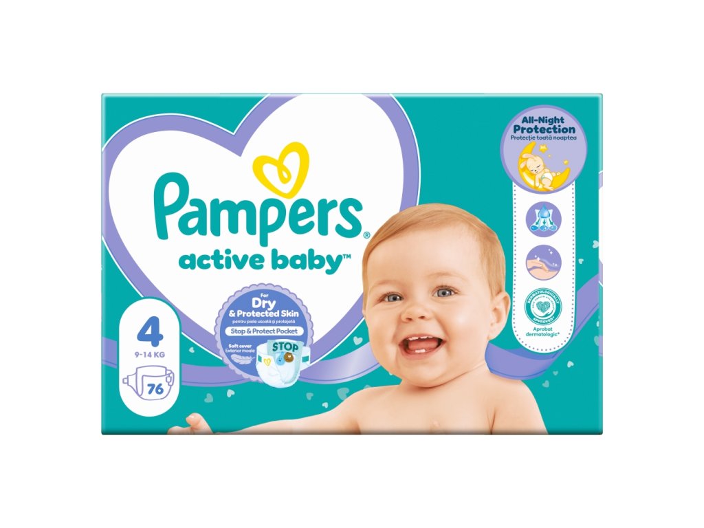 Pampers Active Baby velikost 4, 76 plenic, 9–14 kg, 3 vpojni kanali