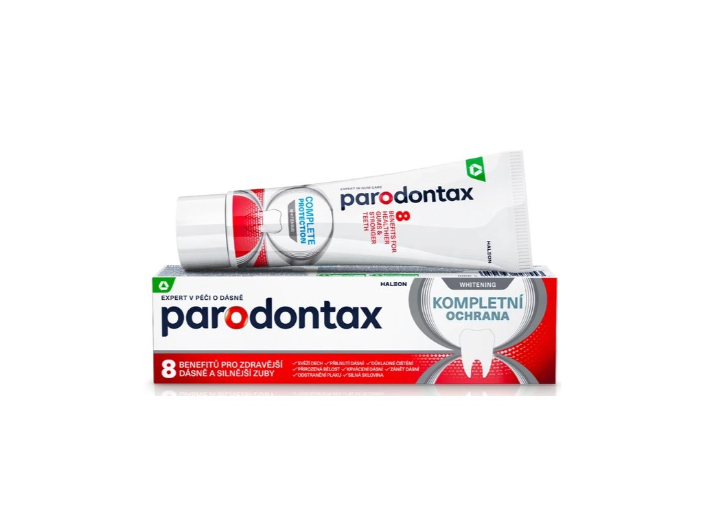 Zobna pasta Parodontax Complete Protection Whitening je zasnovana za vsakodnevno nego dlesni in zob. Posebna formula pomaga odstraniti zobne obloge vzdolž linije dlesni, podpira njihovo zdravje in hkrati nežno obnavlja naravno belino zob. Zahvaljujoč vsebnosti fluorida prispeva h krepitvi zobne sklenine in splošni zaščiti ustne votline.