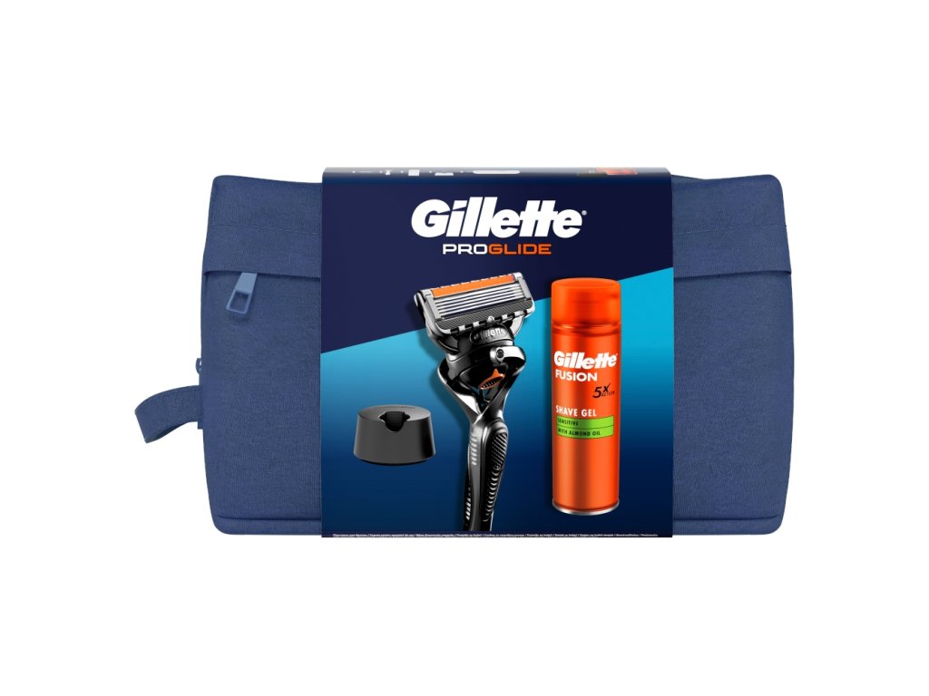 Potovalni set Gillette ProGlide britvica + gel za britje Fusion 200 ml + stojalo