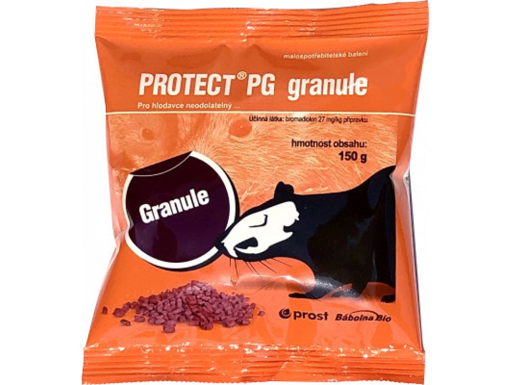 Rodenticid za zatiranje hišnih miši in podgan, namenjen splošni uporabi. Granule so privlačne za škodljive glodavce in vsebujejo grenko snov, ki zmanjšuje tveganje za zaužitje pri otrocih in hišnih ljubljenčkih. Aktivna sestavina: Bromadiolon 27 mg/kg. Izdelek vsebuje grenko aromo, ki zmanjšuje tveganje za zaužitje pri otrocih in hišnih ljubljenčkih. Podgane: 100–200 g vabe na deratizacijsko postajo. Če je potrebno imeti več deratizacijskih postaj, morajo biti te oddaljene vsaj 5 m. Vabe se ne sme uporabljati trajno za preprečevanje okužbe ali spremljanje aktivnosti glodalcev. Uporaba granul Protect PG za zatiranje glodalcev: Pred uporabo izdelka naj splošna javnost pretehta, ali uporaba mehanskih pasti ali drugih nekemičnih metod ne bi zadostovala za dosego želenega učinka. Po potrebi je treba izdelek nanašati na varnih postajah, ki se nahajajo izven dosega otrok, ptic, domačih in kmetijskih živali ter drugih neciljnih organizmov, blizu predvidene prisotnosti glodalcev. Če je mogoče, je treba postaje zavarovati s pritrditvijo na tla ali fiksne točke pred vlečenjem. Pred nanosom izdelka je treba z tretiranih območij odstraniti vso hrano in krmo. Postaje morajo biti označene z opozorilom Ne premikajte ali odpirajte. Vsebuje rodenticid bromadiolon. V primeru nesreče pokličite center za zastrupitve. Pri ravnanju z izdelkom nosite zaščitne rokavice, ne jejte, ne pijte in ne kadite. Po končanem delu si umijte roke in morebitno kontaminirano kožo z milom in vodo. Postaje za zatiranje škodljivcev je treba preveriti najkasneje 5–7 dni po začetku zatiranja škodljivcev in nato vsaj enkrat na teden, da se preveri, ali je vaba sprejeta, ali so postaje za zatiranje škodljivcev nepoškodovane in da se poberejo poginuli glodavci. Po potrebi vabo dopolnite. Odstranite kontaminirano ali poškodovano vabo. Če se populacija glodalcev ne zmanjša v 35 dneh od začetka zatiranja škodljivcev, se posvetujte z dobaviteljem izdelka ali se obrnite na službo za zatiranje škodljivcev. Izdelek in glodavci, zastrupljeni z izdelkom, so lahko nevarni za otroke, neciljne živali in ptice. Opozorilo: Navodila za odstranjevanje izdelka in kontaminirane embalaže: po koncu zatiranja škodljivcev neuporabljeno in neuporabno vabo ter kontaminirano embalažo zavrzite kot nevarne snovi. Najprimernejša metoda je sežig v sežigalnici nevarnih odpadkov. Poginule glodavce lahko odstranimo s sežigom ali zakopom na mestu, kjer podtalnica ne bo onesnažena. Posamezne živali, ki poginejo med nestrokovnim posegom, lahko oddamo v sistem zbiranja komunalnih odpadkov.