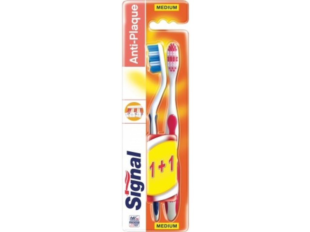 Zobna ščetka SIGNAL Antiplaque srednje trda 2 kosa je zobna ščetka z običajno razporeditvijo ščetin, ki je priporočljiva za temeljito čiščenje zob. Srednje trde ščetine na glavi so primerne za normalne zobe brez večje občutljivosti. Zelo pomembna je oblika glave in ročaja, ki vam zagotavlja odličen dostop tudi do posebej težko dostopnih mest.