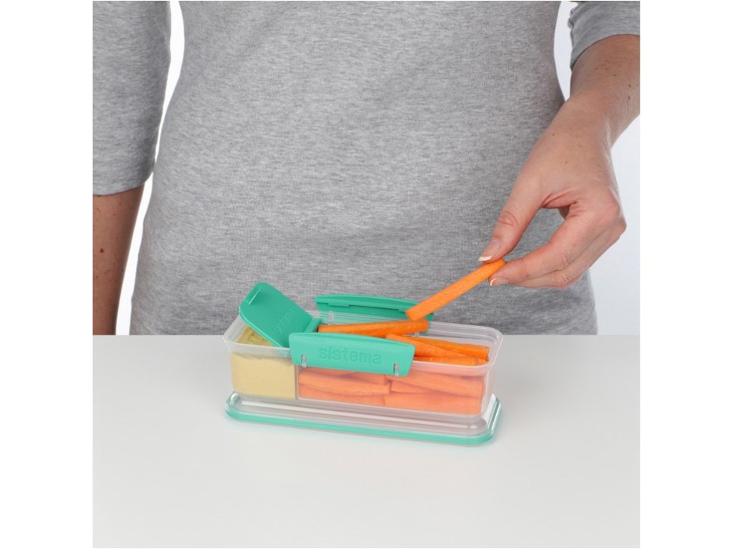 Sistema škatla za malico z ločenim predalom 410 ml je praktična rešitev z dvema ločenima predaloma za pripravo okusnih prigrizkov in kosil, ne le za na pot. Hkrati pa pomagate zmanjšati uporabo plastičnih vrečk in folije. Škatla je izdelana iz trpežne plastike in ima enostavno zaklepljive sponke ter fleksibilno tesnilo za ohranjanje svežine. Prednosti: Primerno za otroke Enostavno zaklepljiva sponka in pokrov na tečajih Dva predala za ločeno shranjevanje prigrizkovDodatni parametri