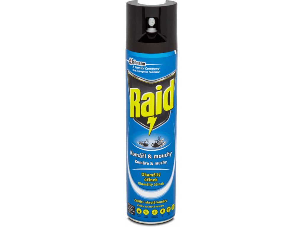 Raid proti komarjem in muham je insekticid v aerosolu na vodni osnovi s svežim vonjem za takojšnje uničevanje letečih žuželk, kot so komarji, muhe, njihova jajčeca, pa tudi ose in druge. Zagotavlja dolgotrajno zaščito in deluje tudi kot preventivni repelentni sprej. Ima zelo prijeten vonj, hkrati pa zagotavlja neposredno zaščito do 24 ur in deluje tudi kot preventivni repelentni sprej.