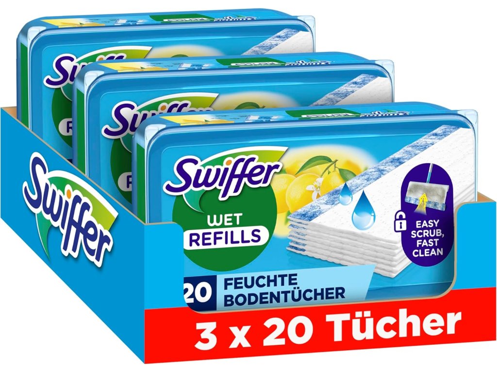 Nadomestni čistilni robčki Swiffer Wet so prepojeni z močnimi čistilnimi sredstvi, ki raztopijo umazanijo, jo dvignejo s površin in jo vpijejo. Ohranite svoja tla čista in dišeča z edinstveno čistilno raztopino, ki raztopi trdovratne madeže, umazanijo in nečistoče z vaših tal ter jih vpije globoko v tkanino, kar olajša čiščenje tal v vašem domu, tudi na težko dostopnih mestih. Grobejši moder trak okrepi čistilni učinek in olajša odstranjevanje trdovratnih madežev. S Swiffer Wet boste v trenutku spet čisti. Primerni so tudi za uporabo na lesenih tleh. Čistilnih robčkov Swiffer Sweeper ne uporabljajte na neobdelanih, naoljenih ali voskanih lesenih površinah ali na nelepljenih ploščicah ali preprogah.