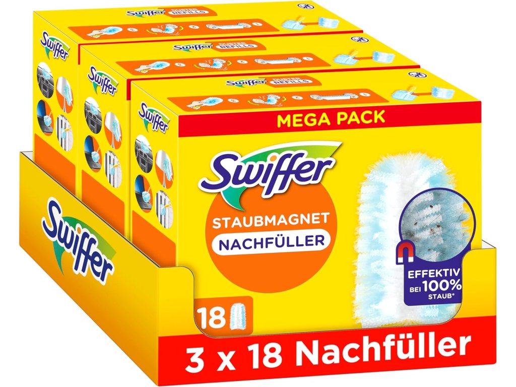 Nadomestne krpe za prah Swiffer Duster so magnetno pritrjene na tisoče puhastih vlaken, ki lovijo prah, umazanijo in dlake na kateri koli površini. So učinkovito orodje za vse vrste prahu, ne da bi ga raztresli naokoli . Ponovno zrahljajte krpo Swiffer Duster in se v hipu vrnite k čiščenju. Še posebej so primerne za zbiranje dlak hišnih ljubljenčkov, ki nenehno izgubljajo dlako, in za ljudi, ki trpijo zaradi alergij na prah. Nadomestne krpe za prah Swiffer Duster so združljive s kratkimi in XXL ročaji.