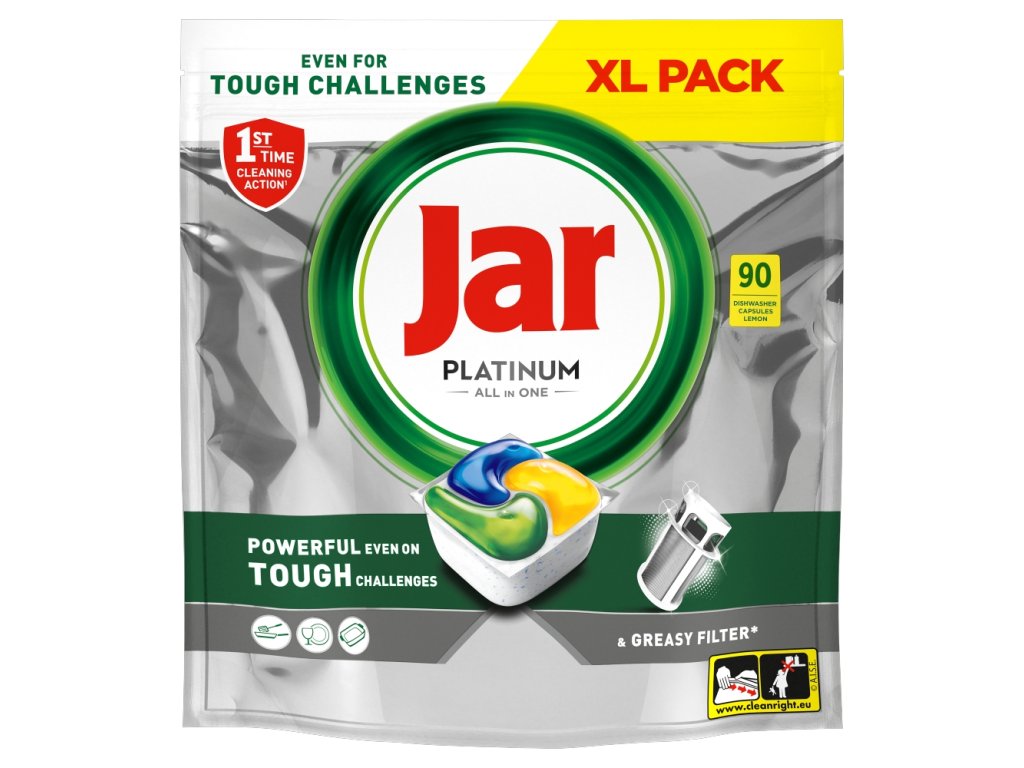 Kapsule za pomivalni stroj Jar Platinum All-in-One so učinkovite že od prvega pomivanja in se spopadejo tudi z najtrdovratnejšo umazanijo, zato se bo vaša posoda svetila do čiste. Kapsule Jar Platinum imajo čistilno moč, zaradi katere se ne boste bali kuhati ničesar. Lahko ste prepričani, da vam bodo pomagale očistiti tudi masten filter vašega pomivalnega stroja, tako da se bo vaša posoda svetila do čiste, pomivalni stroj pa bo dišal po svežem. Jar združuje tekoči in praškasti detergent za pomivanje posode v eni učinkoviti kapsuli. Visoko topna embalaža se hitro raztopi, zato se posoda začne takoj pomivati. In kapsule so tako enostavne za uporabo.