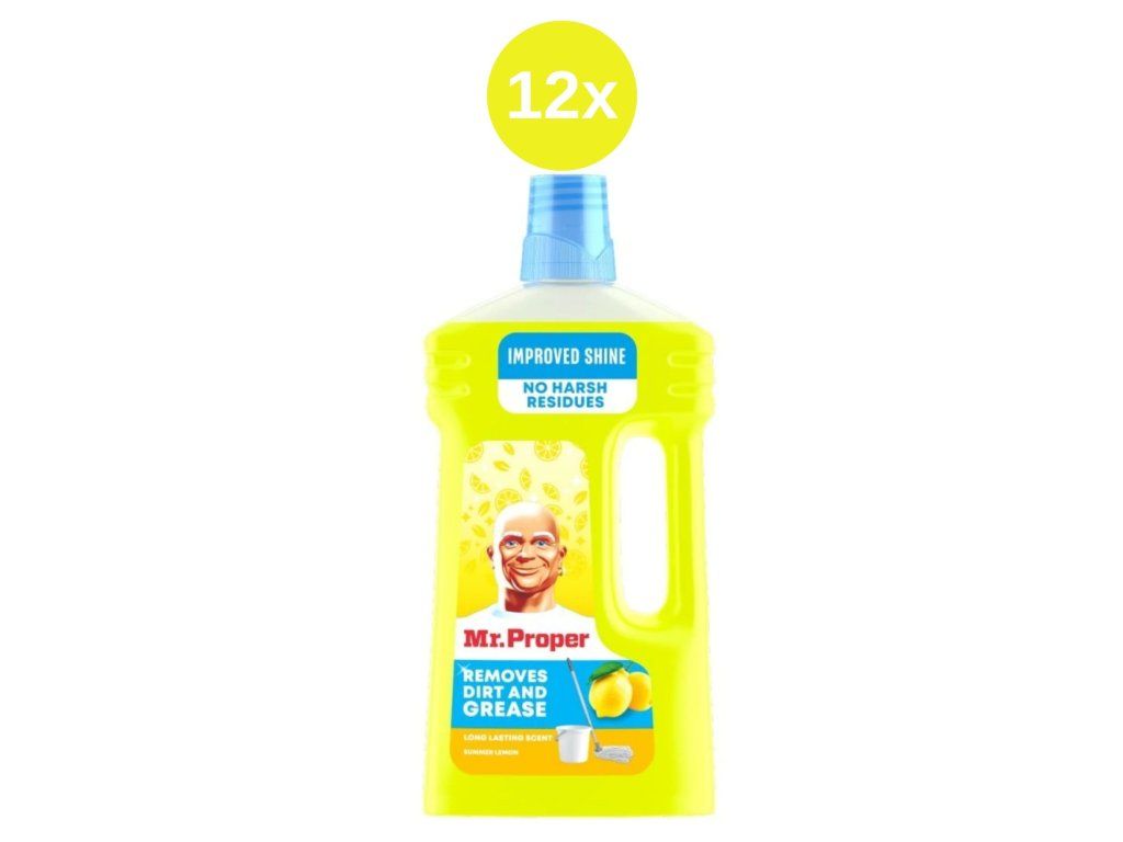 Večnamensko čistilo Mr. Proper je odlično za čiščenje skoraj vseh trdih površin v vašem domu. Odlično je za čiščenje kuhinjskega pomivalnega korita, odstranjevanje maščobe s kuhalne plošče in čiščenje običajnih tal. Tekoče čistilo Mr. Proper odstrani umazanijo in maščobo ter zaradi svoje rastlinske formule (12 % vseh predelanih površinsko aktivnih snovi) ne pušča sledi. Odkrijte naš najboljši sijaj doslej. Z lepim vonjem bo vaš dom čudovito dišal po sveži limoni.