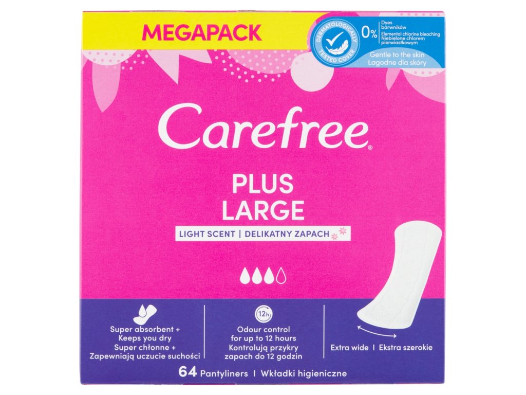 Maksimalno udobje in 100 % zanesljiva zaščita med menstrualnim ciklom. Ženski higienski vložki Carefree Large vam bodo nudili občutek udobja in varnosti skozi ves dan.