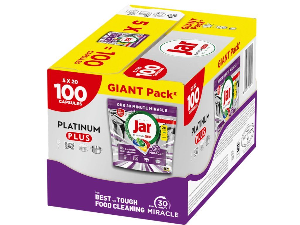 Kapsule za pomivalni stroj Jar Platinum Plus Miracle (5x20 kosov) so zelo učinkovite tablete "vse v enem", zasnovane za maksimalno učinkovitost čiščenja tudi pri kratkih programih pomivanja. Zahvaljujoč praktičnemu večjemu pakiranju dobite idealno kombinacijo zmogljivosti, udobja in vrednosti za denar.